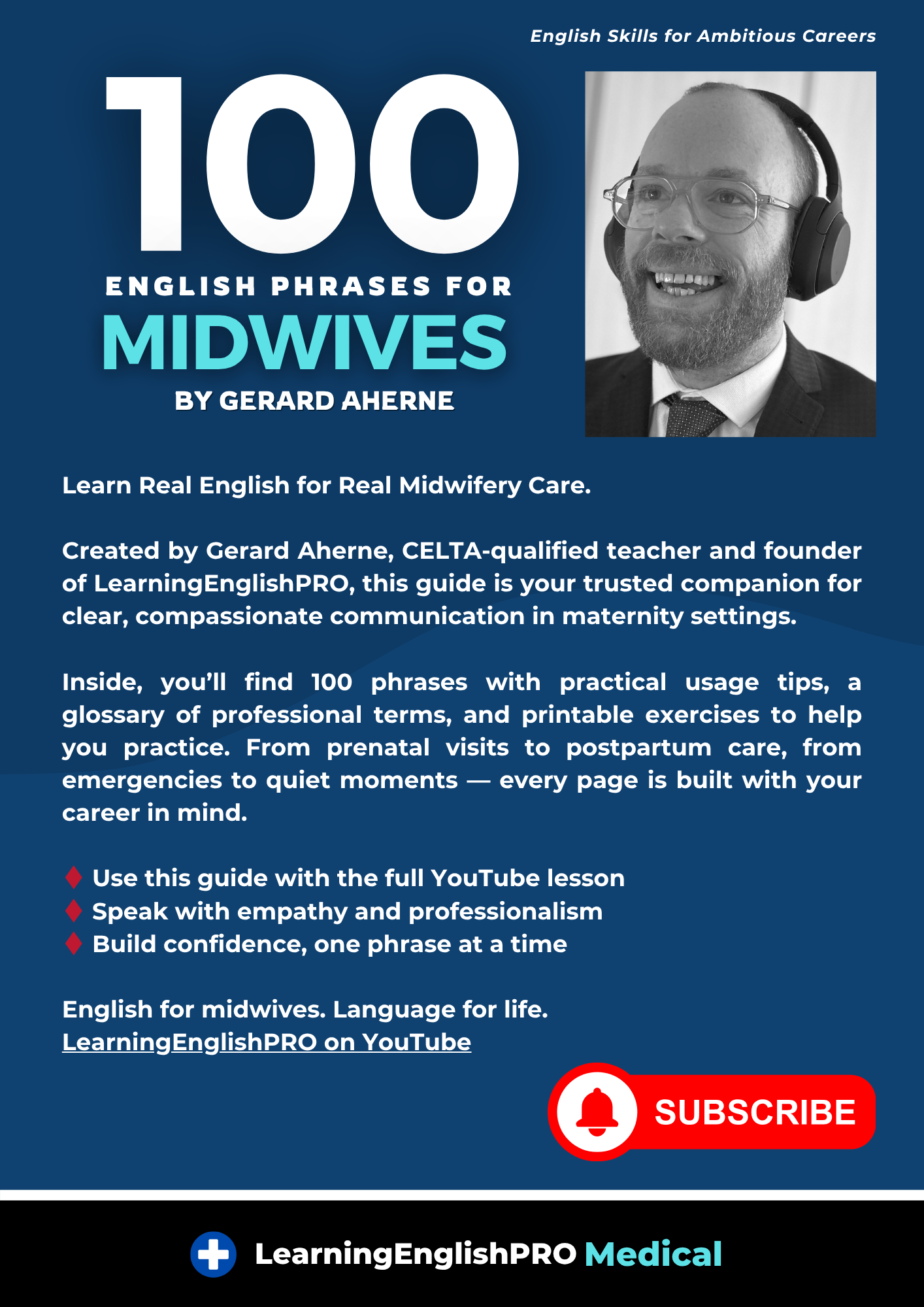 100 English Phrases for Midwives from LearningEnglishPRO is your complete PDF companion to the YouTube pronunciation lesson. It’s designed for midwives. nurses. doulas. and student healthcare workers looking to speak confidently in real medical settings.