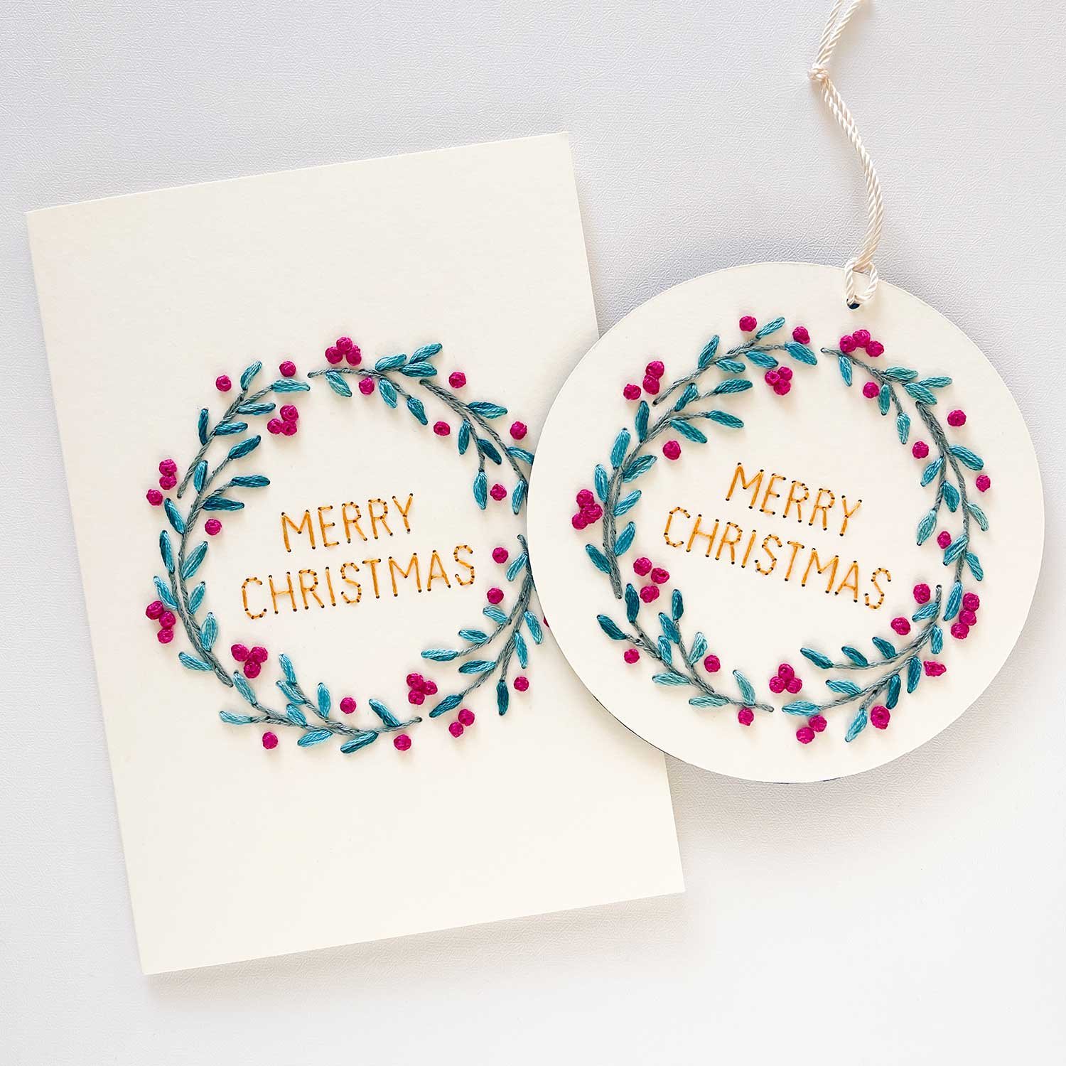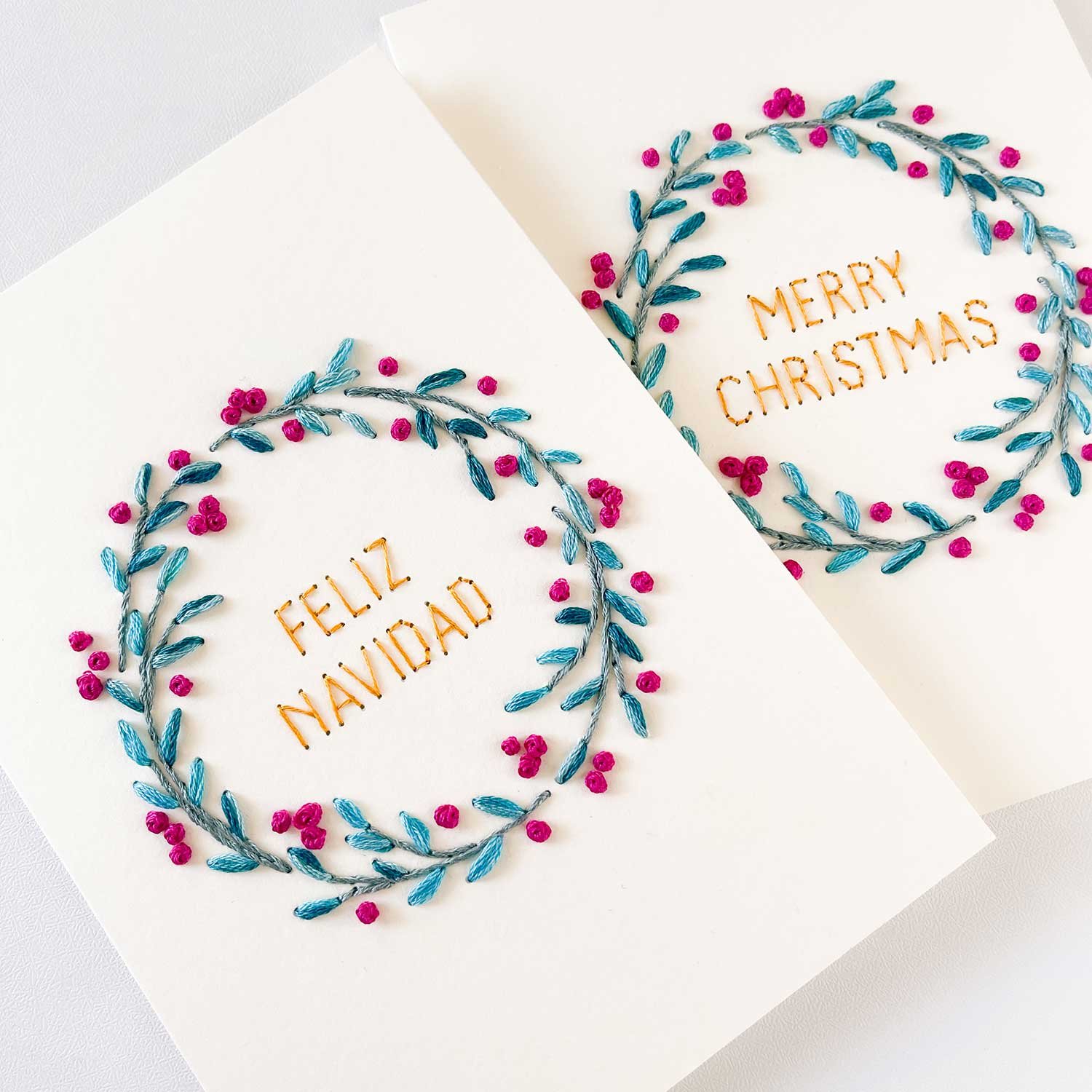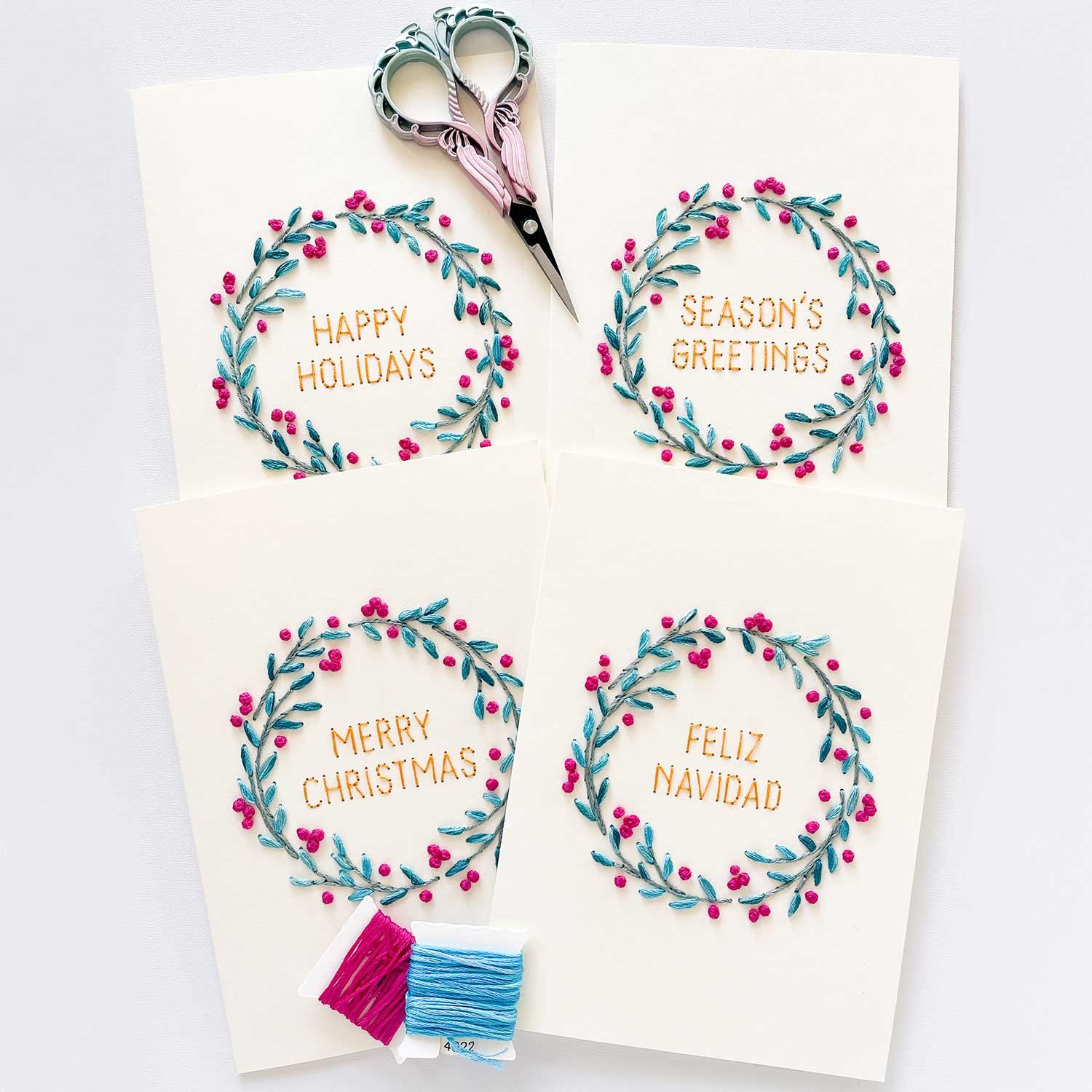 Create a modern. handmade holiday keepsake with our Berry Wreath paper embroidery pattern! This versatile pattern offers two designs: an A7 card and a circular ornament. PLUS. four festive phrases to stitch inside your wreath are also included: Happy Holidays. Merry Christmas. Feliz Navidad. and Season’s Greetings.