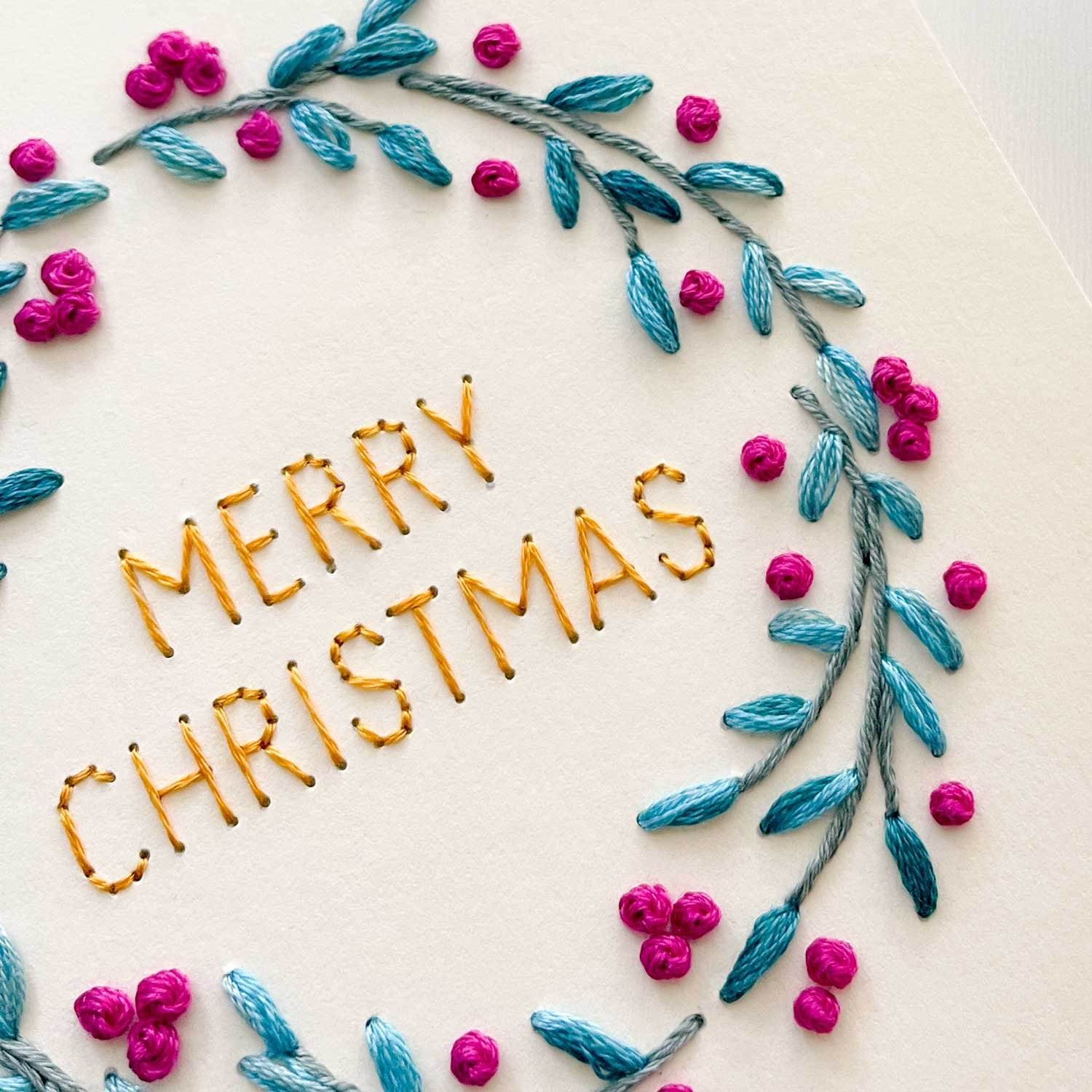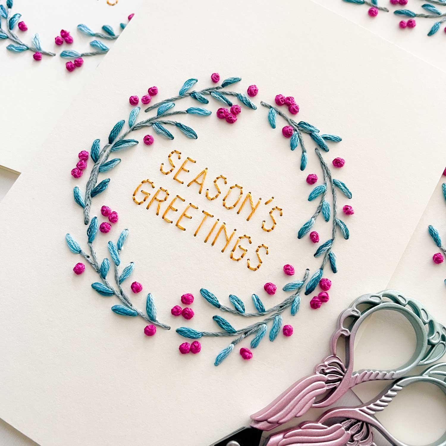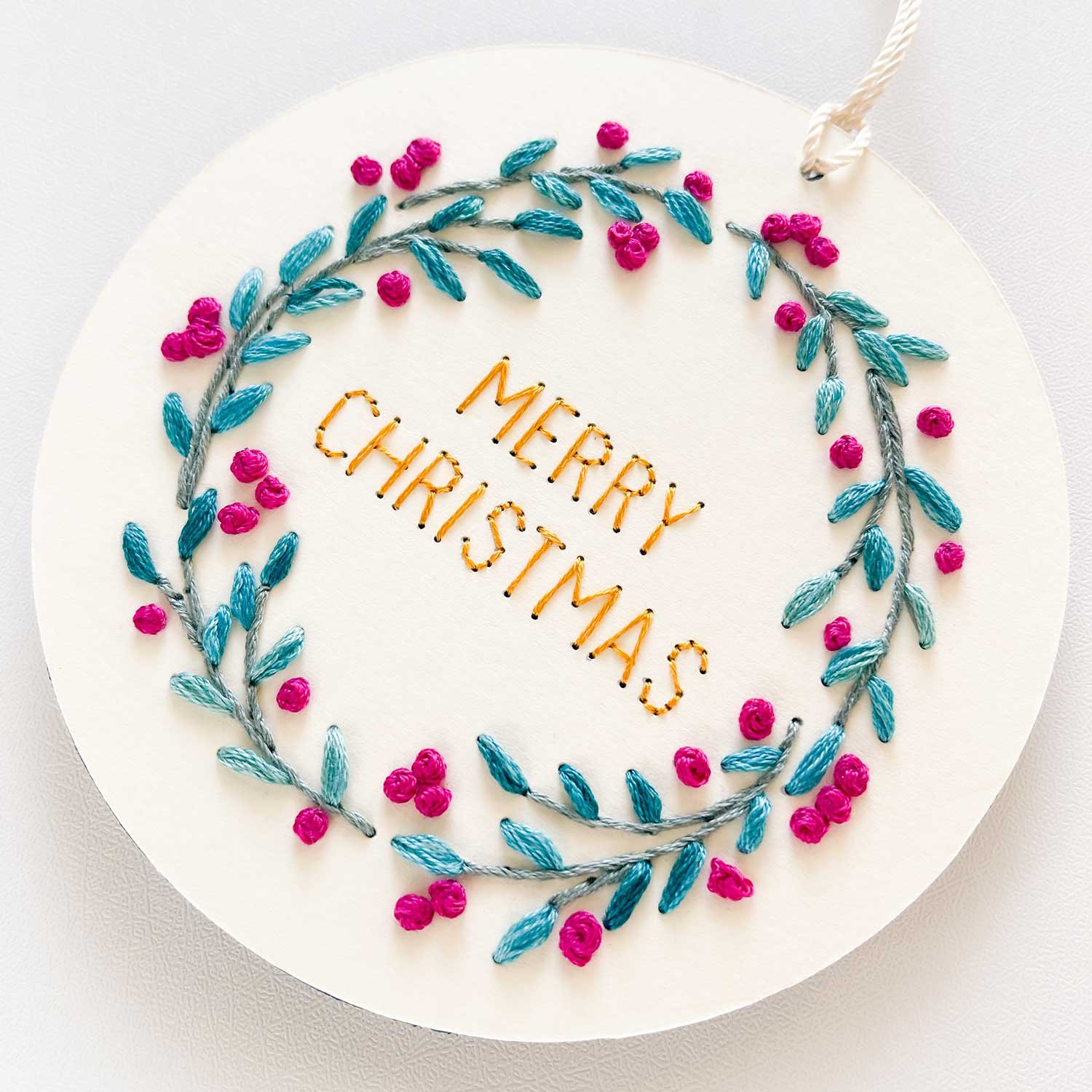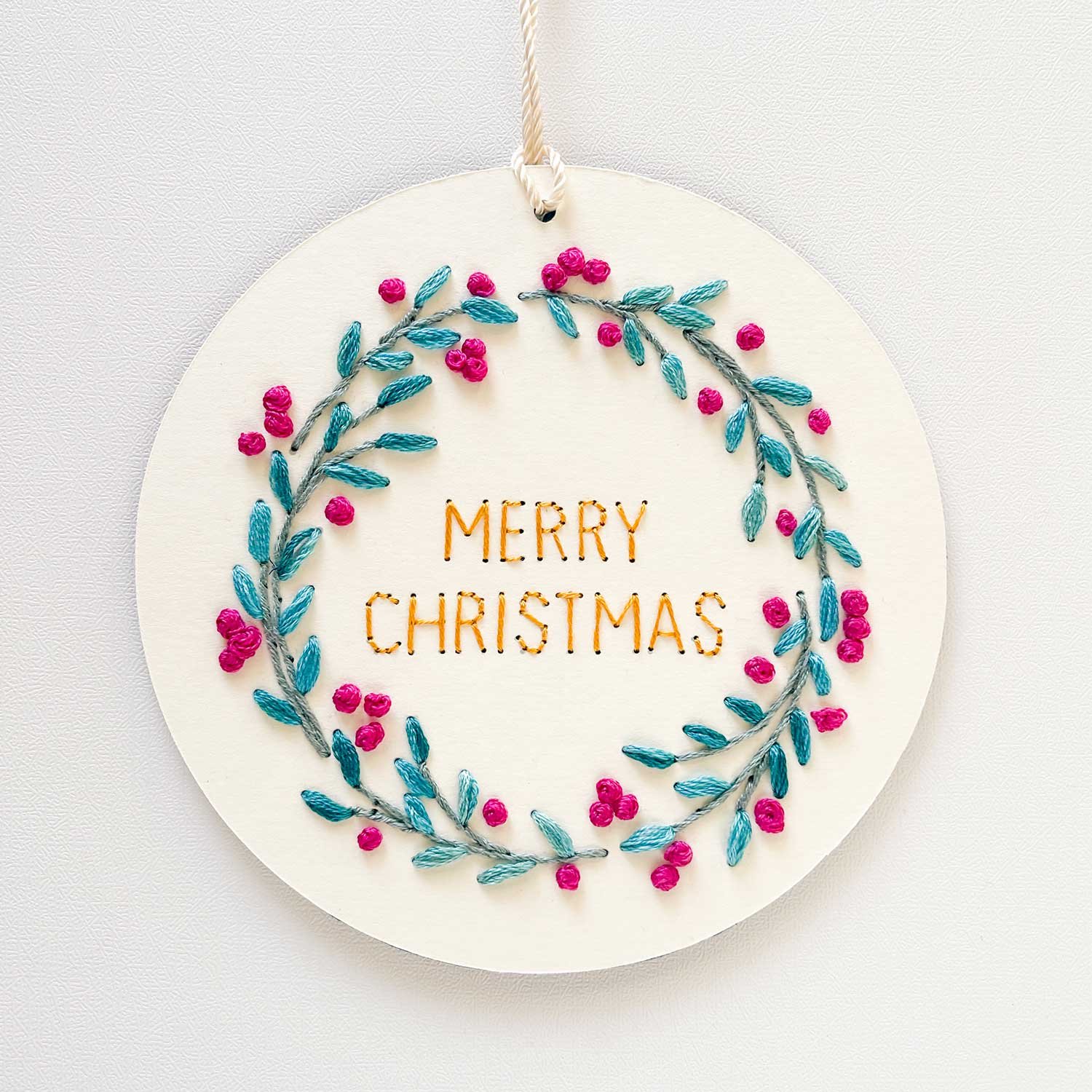 Create a modern. handmade holiday keepsake with our Berry Wreath paper embroidery pattern! This versatile pattern offers two designs: an A7 card and a circular ornament. PLUS. four festive phrases to stitch inside your wreath are also included: Happy Holidays. Merry Christmas. Feliz Navidad. and Season’s Greetings.